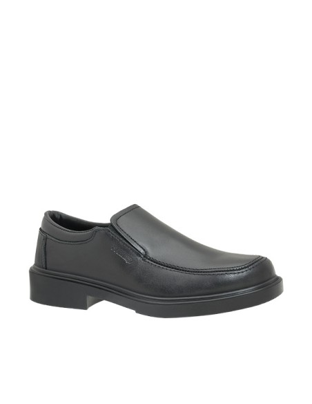 Calzado laboral para hombre tipo mocasín en color negro y piel 1ª flor natural hidrófuga, escogida por su calidad, resistencia y capacidad transpirable. Zapato antifatiga, para profesionales que pasan mucho tiempo de pie. Calzado profesional tipo ejecutivo, formal, urbano, oficina, uniforme...