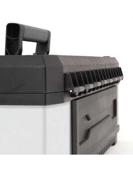 Caja de metal y plástico. Gracias a su altura adicional permite almacenar las herramientas verticalmente. Cierres metálicos antioxidantes. Posibilidad de cierre con candado. Mango bimateria ergonómico. Ranura en la tapa en forma de V. Bandeja interior.