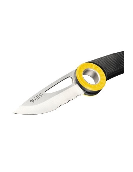 La navaja SPATHA está diseñada para acompañar al trabajador en altura durante su trabajo diario. El perfil de la hoja permite cortar fácilmente cuerdas y cordinos. Dispone de un orificio para pasar un mosquetón y colgar con facilidad la navaja del arnés. Fácil de manipular, incluso con guantes, gracias a la rueda dentada. También dispone de seguro para bloquear la hoja en posición abierta.