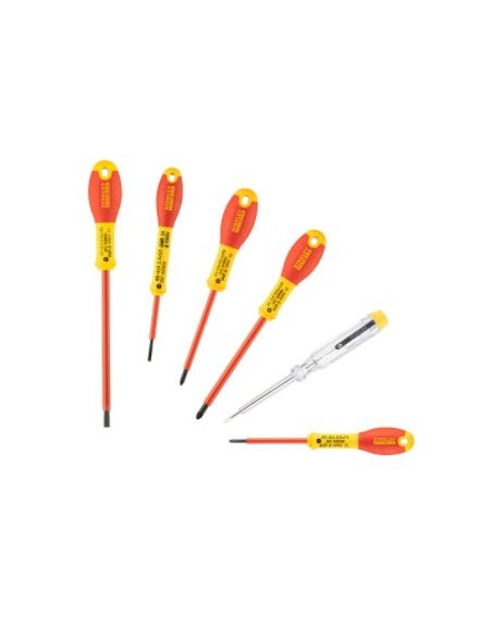 Juego de 3 destornilladores electricista, 2 Pozidrive y 1 Test de Voltaje, con mango bimateria ergonómico y de gran diámetro, lo que ofrece una gran capacidad de torsión. Cuello delgado para una rápida rotación. El mango está moldeado directamente sobre la varilla de acero. Se puede colgar gracias a su agujero en el mango. Código de color en el mango para identificación del tipo de punta. Calidad industrial 1.000V a.c aislamiento. Comprobado individualmente norma EN60900:2004. Protege de la corriente hasta 1.000V a.c. Funda protectora aislante de Poliamida extremadamente resistente hasta una temperatura de -25ºC, que asegura resistencia a la corrosión y minimiza el riesgo de absorción de humedad.