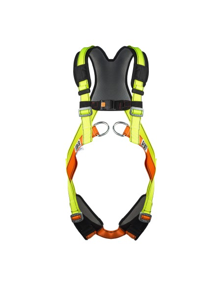Dispone de dos puntos de enganche anticaídas, uno en la zona dorsal y otro en la zona pectoral. Consta de hombreras y perneras regulables y acolchadas para proporcionar mayor confort al usuario evitando los roces. Fabricado con dispositivos de regulación de apertura automática en las perneras.