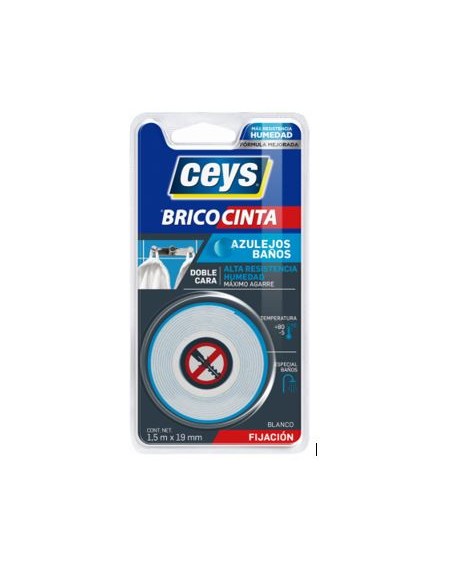 CEYS BRICOCINTA AZULEJOS Y BAÑOS es una cinta doble cara instantánea de alto rendimiento para fijar en vertical objetos planos sobre azulejos, y especialmente en zonas de alta humedad tales como el baño.