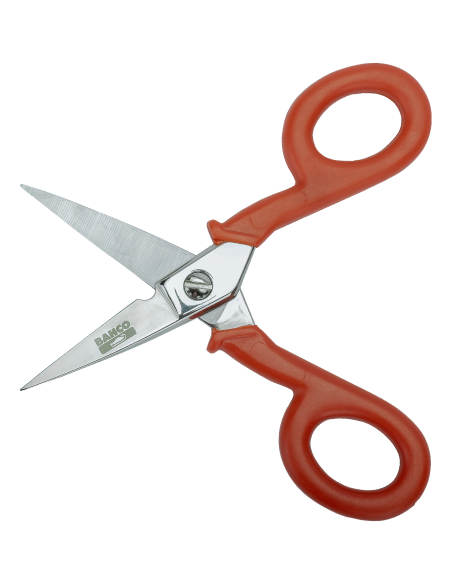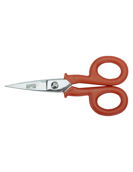 Tijeras de electricista con anillas recubiertas de plástico.