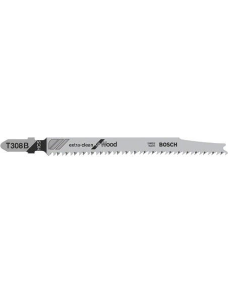 La hoja de sierra de calar T 308 B Extra-Clean for Wood proporciona cortes rectos y extralimpios en madera. Sus dientes fresados con precisión y con cuerpo cónico rectificado cortan limpiamente. Además, dos hileras de dientes dispuestas con ángulos distintos proporcionan cortes sin desgarros las superficies superior e inferior. La hoja está hecha de HCS (acero con alto contenido de carbono) y es adecuada para cortar madera blanda y materiales no abrasivos para trabajos en madera. Cuenta con geometría de diente 2,2XC, espacio entre dientes fino (2,2 mm) y gran longitud (117 mm) para cortar materiales de madera con grosores de 5-50 mm.