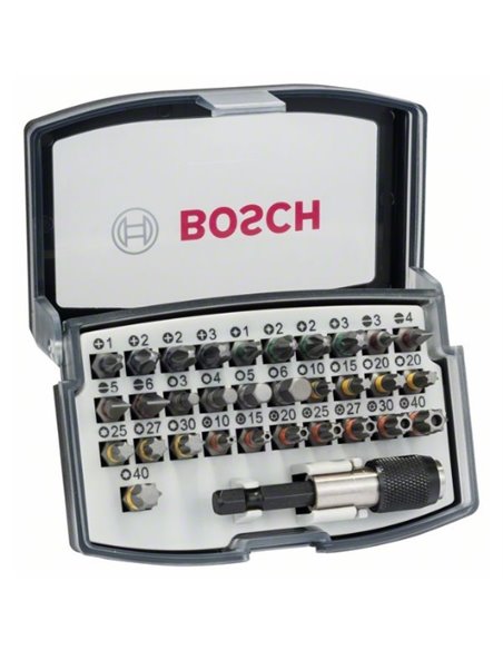El set de puntas de atornillar de 32 piezas es una buena opción para un uso universal. Este set de varias puntas de atornillar se suministra en una pequeña caja compacta con tapa transparente, que se puede colocar en un cinturón para acceder fácilmente a ella. Las puntas están codificadas por colores para ver e identificar el tipo adecuado rápidamente. El set de puntas de atornillar de 32 piezas se suministra en una caja de almacenamiento práctica y robusta que permite ver bien su contenido y, además, proporciona un almacenamiento y transporte seguros.
