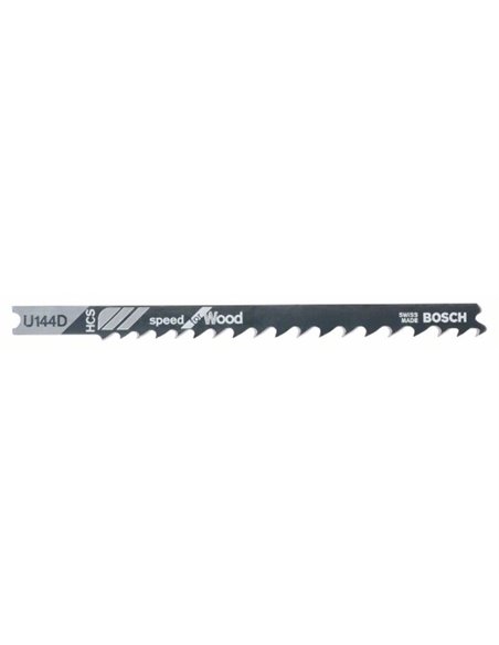 La hoja de sierra de calar U 144 D Speed for Wood proporciona cortes rectos y rápidos en madera. Sus dientes fresados afilados y destalonados permiten obtener resultados rápidamente. El material de la hoja de acero con alto contenido de carbono es adecuado para cortar madera blanda y materiales no abrasivos para trabajos en madera. Además, el espaciado entre dientes amplio y progresivo (4-5,2 mm) de la hoja permite cortar distintos materiales de madera con un grosor de 5 a 50 mm.