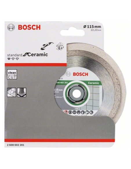 El disco de corte con diamante Standard for Ceramic proporciona cortes seguros en baldosas. Su borde de corte continuo consigue resultados precisos en cualquier tipo de baldosas. Además, los altos estándares de calidad del disco están garantizados por el centro especializado en diamantes de Bosch en Suiza. Utilice este disco para cortar cerámica, porcelánico y gres.