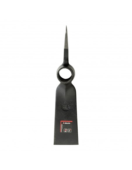 Pulida y afilada para facilitar la introducción en la tierra. Doble uso: Hacha y azada. Labores forestales, limpieza y corte de raíces.