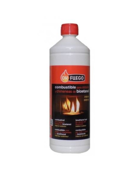 El combustible para estufas y chimeneas de bioetanol OK FUEGO permite disfrutar del fuego de forma rápida y limpia. Su combustión no genera humo ni hollín, ya que lo único que se genera del combustión son el vapor de agua y el anhídrido carbónico (CO2), elementos que se encuentran en el aire que respiramos. No desprende malos olores. COMPOSICIÓN: Alcohol etílico desnaturalizado. Alcohol isopropílico. MODO DE EMPLEO: Llenar el depósito de la estufa o chimenea con el combustible. PRECAUCIONES: Rellenar el depósito únicamente cuando esté frío. Encender con precaución. Úsese en lugares bien ventilados. ADVERTENCIAS: Conservar alejado de las llamas. Mantener el envase bien cerrado y en lugar seco y seguro, fuera del alcance de los niños.