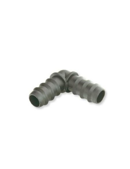 El codo 90º de 16 mm está hecho con un material muy resistente. Se usa en el riego por goteo, para direccionar o hacer una esquina en el tubo de riego. El diámetro de ambas bocas es el mismo (16 mm). Con este codo evitarás atascos y dobleces en tus manguitos y sin reducir el caudal de agua.